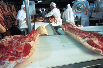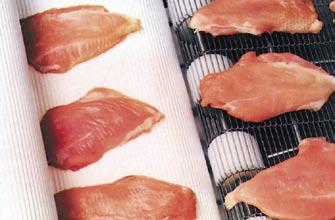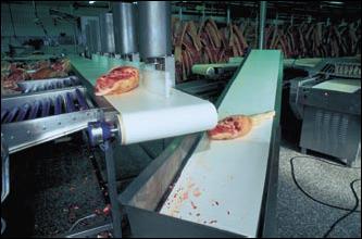 TPU輸送帶廣泛應用于屠宰行業的宰殺、切割、脫骨、切片、剁碎、冷凍和包裝過程中。為了保證食物的安全和質量,不同過程要求也不同.新研制的藍色輸送帶減少了來自輸送帶自身的污染,包邊技術的應用也改進了輸送帶的質量。另外,可加導條、擋板以適應不同需要而特別製作 流程 在宰殺和切分過程中,為了防止動物的血和脂肪浸染輸送帶影響其品質,我們強力推薦防油、耐壓的PU輸送帶和ORPVC輸送帶。