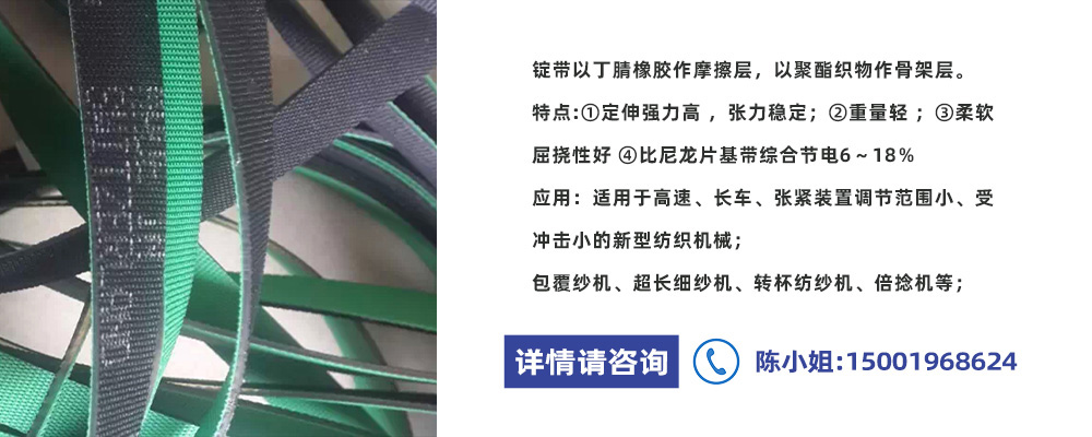 2、用于平行或雙面傳動的平帶系列,如:梳棉機、粗紗機、細紗機、并條機、針織圓機等等用平帶和錠 帶。