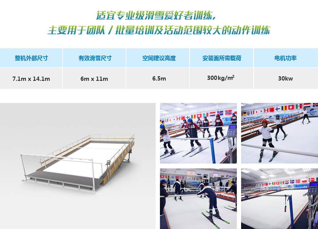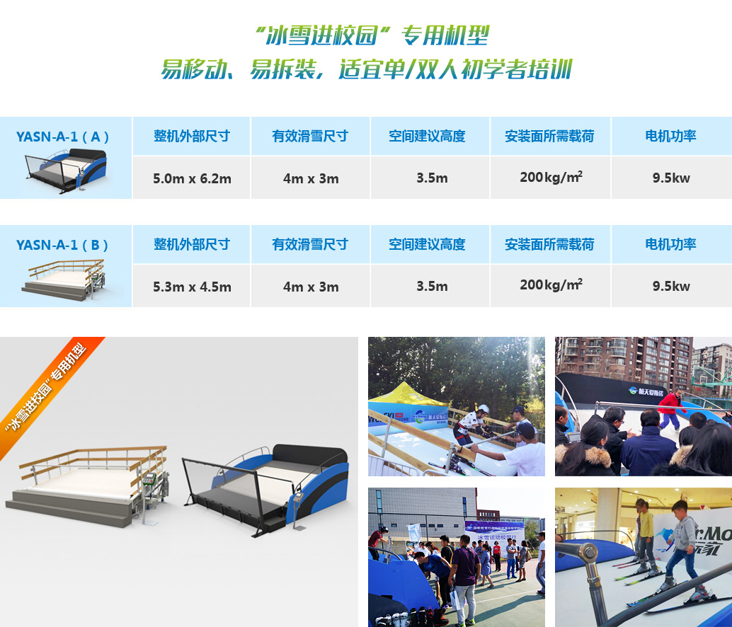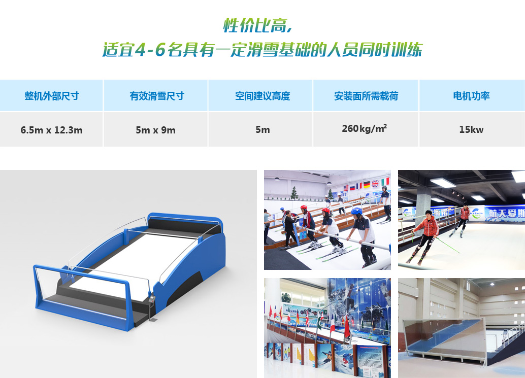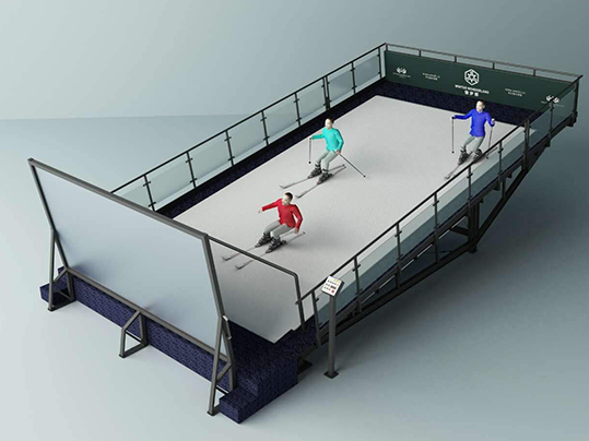 室內滑雪機,用于普及滑雪,滑雪技能訓練與進階。應用特質材料模擬滑雪表面,通過滾軸轉動滑雪毯使得雪道變得“無限長“,使得大眾可輕松通過滑雪機,迅速、安全的掌握滑雪技能。 延誼開發三個系列滑雪機:w——啟迪系列,可升降變角度、速度機型。d——動感系列,可多軸萬象調節角度。a——進階系列,結合視頻模擬技術的交互式機型,同時延誼公司積極引進國外進口傳輸帶及雪毯,兩者完美融合,極具流暢。