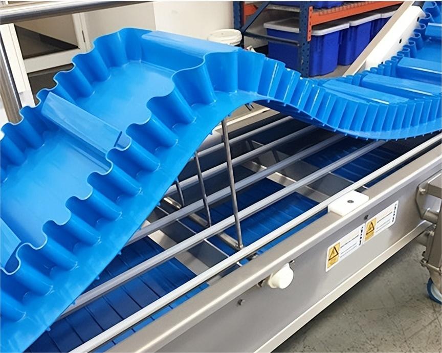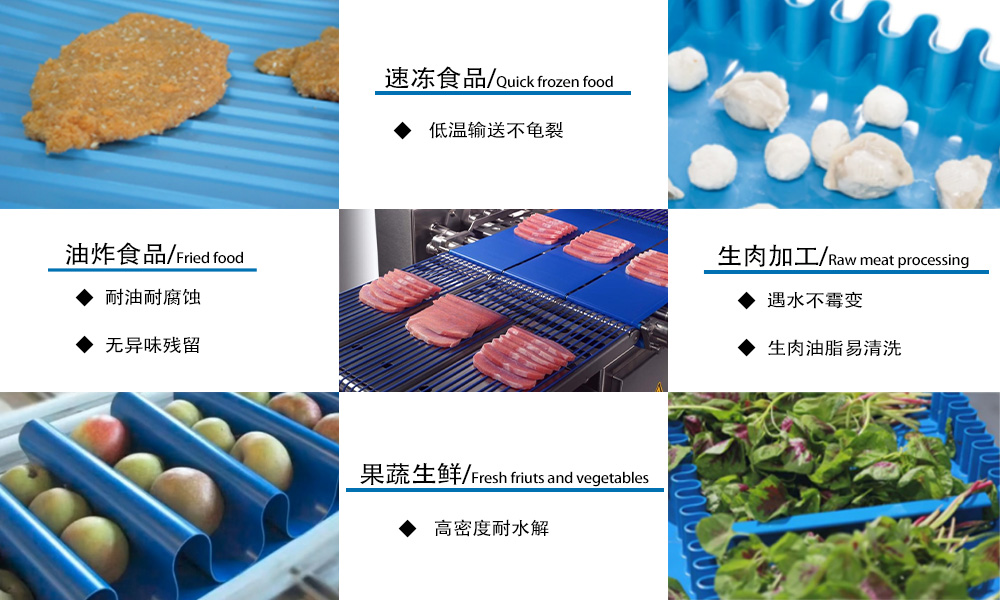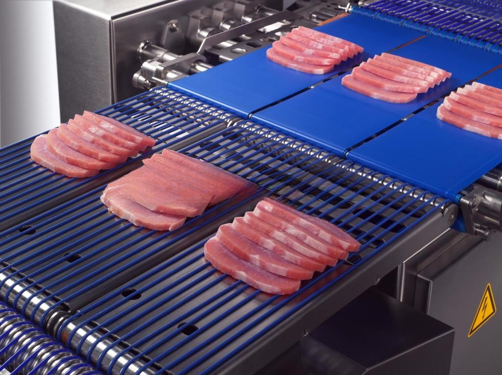 傳統式帶布層塑料型輸送帶因本身不耐切割,被切過而產生出的空隙容易滋生大量細菌; 且因本身由布層結構組合而成,容易受到血水污染而造成分層問題使得此類輸送帶壽命大都不長。鏈板模塊輸送帶是另一種常見用在肉品分割行業中的輸送帶。此類輸送帶壽命長但因卡槽過多造成清洗時需大量清水、化學藥劑、人力和時間且難以有效的完整清洗。