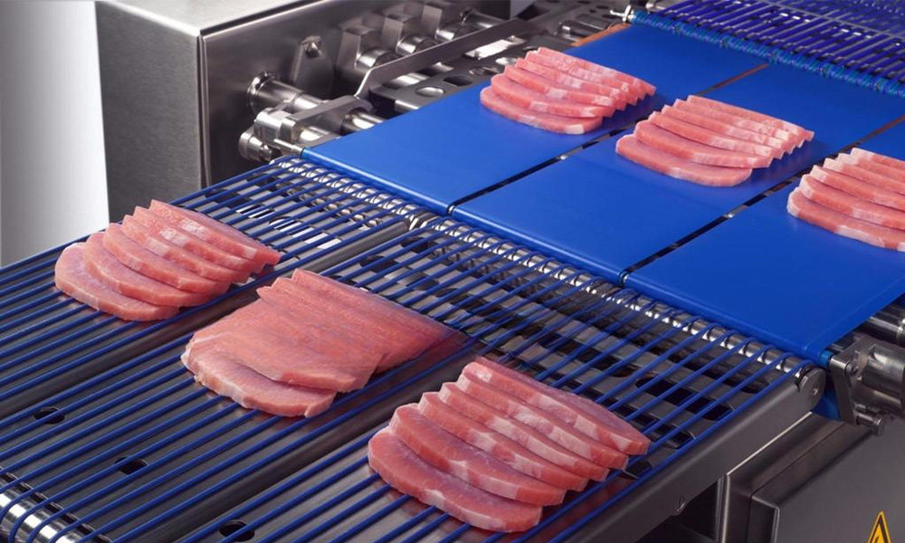 在食品行業中,輸送帶是作為直接與食品接觸的媒介,因此輸送帶本身的食品安全可靠性變得格外重要; 舊式的肉品分割行業中使用最多的輸送帶為 1) 傳統式帶布層塑料型輸送帶 2) 鏈板模塊輸送帶。